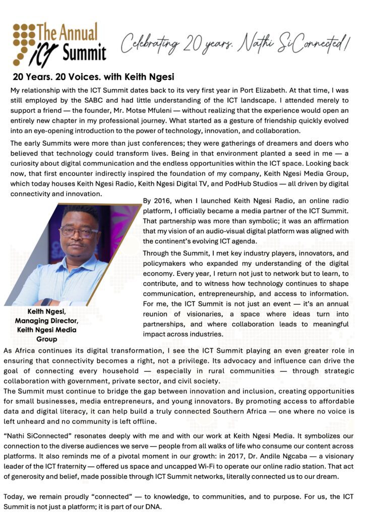 The ICT Summit is proudly hosted in the Eastern Cape every year, and function as the business platform where organisations engage in revolutionary conversations, engaging networking for business growth and development opportunities. The ICT Summit creates platforms to strategize and discuss new topical ICT issues, trends, innovative ideas, and global economic changes within the ICT & Telecoms industry. One of the Summits prime platform is to showcase the latest trends and solutions within the industry across South Africa and globally. Each year it focuses on a different theme related to the ICT Sphere at large, highlighting key ICT topical issues over a two-day Summit and Showcase. The Summit has succeeded in achieving this for over seventeen consecutive years.